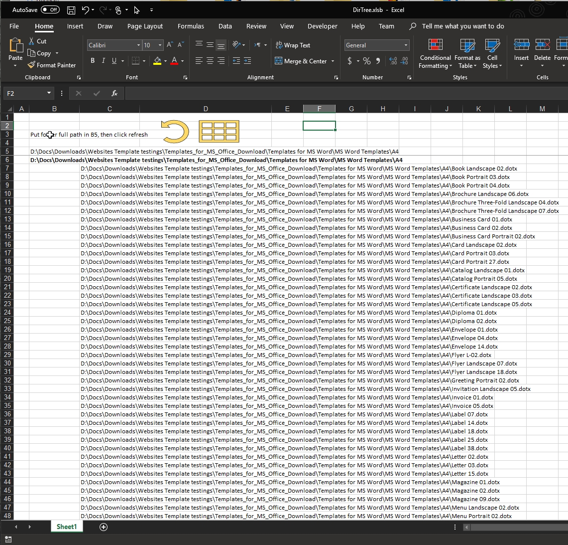 Excel macro to show all files found in directory (including sub-directories) as cells inside Excel sheet.