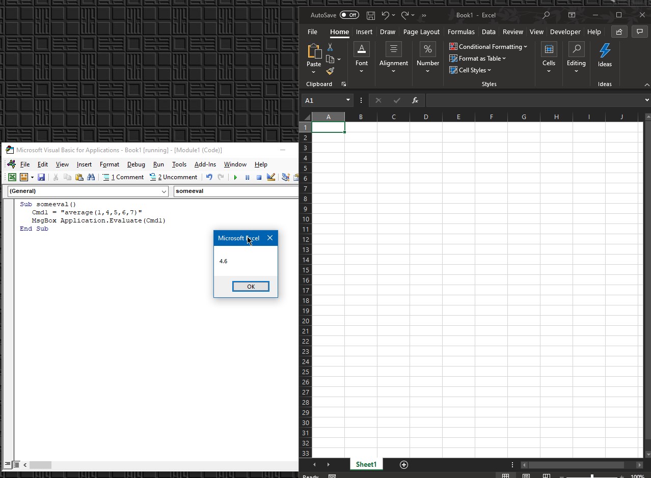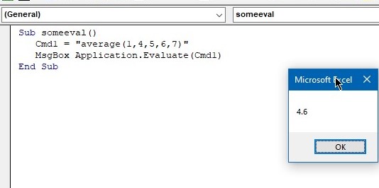 Execute any command in Excel VBE, using Application.Evaluate to execute almost any Excel/VBA command
