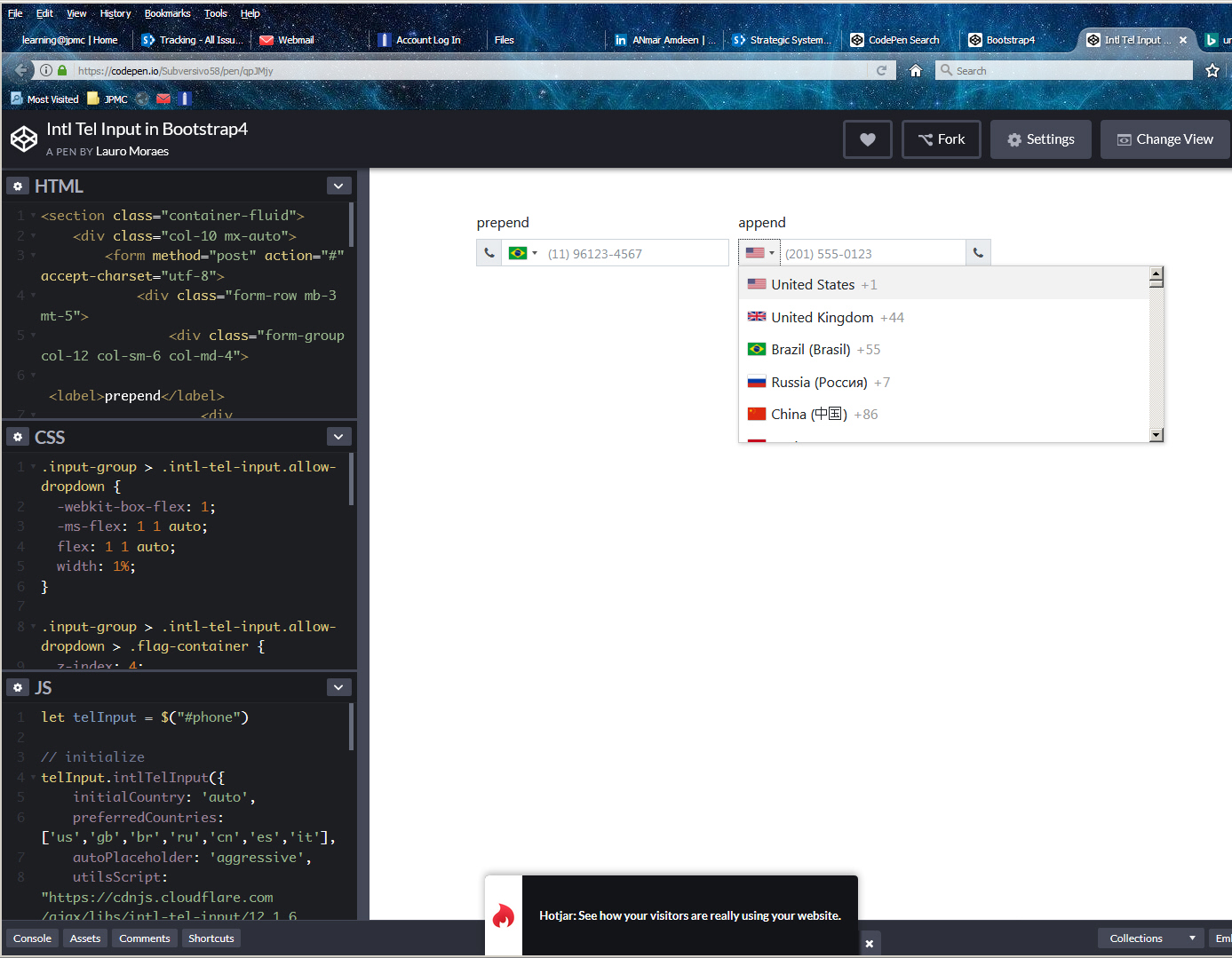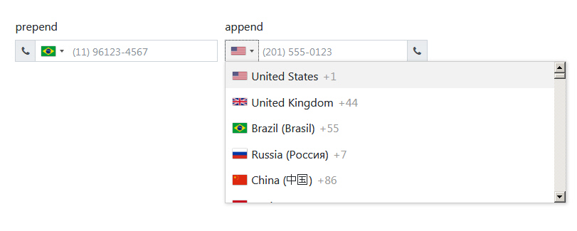 Telephone number input box, using Bootstrap4, with list of countries and country phone codes.